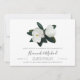 O convite para a parte do noivado floral moderno apresenta blocos quicos e letras itálicas misturadas com elegante roteiro manuscrito, tocado por um par de flores brancas de magnólia e folhas verdes escura e escamosas.