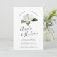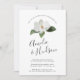 Nosso convite à festa de noivado de Grandiflora apresenta uma flor branca de magnólia solteiro com folhas verdes e peludas, tocando seus detalhes de celebração de noivados em uma mistura chic de blocos, itálico e tipografia de script com letra de mão. Uma escolha nova e elegante em verde e branco.