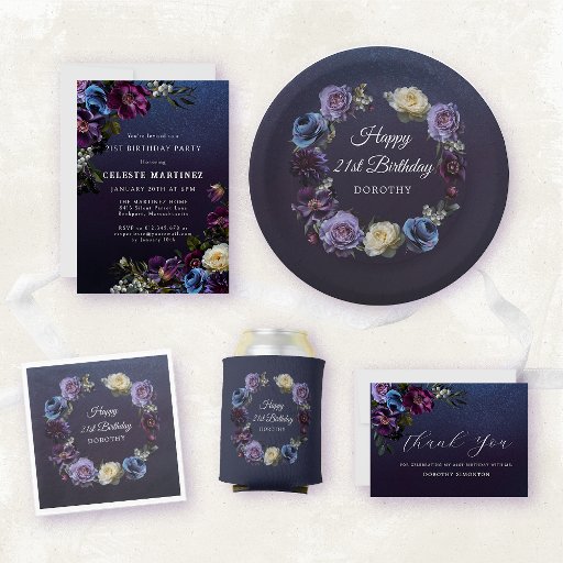 Flores roxas moveis criam uma borda exuberante neste convite de festas aniversário de 21 anos. Pop de azul empoeirado e branco de marfim acrescentam ao monitor floral. Um fundo escuro aumenta o humor e torna o texto branco pop. A escrita tradicional da caligrafia lhe dá uma vibração elegante. Exceto pela palavra aniversário, todo o texto é editável. Você pode optar por fazer o pedido em papel ou baixar uma versão digital. Este item faz parte da coleção Moody Purple Floral. Ele contém modelos que você pode usar para criar suites de convites exclusivos, bem como modelos para sinais de boas-vindas, suprimentos de festas e decorações.