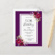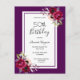 Na frente: Um fundo púrpura chico com um quadro simples de burgôs, preto e branco. Decorado com flores, rosas em ouro de burlu e rosa. Modelos para o seu nome e detalhes da sua festa. O nome e o texto: 50º (ou qualquer idade) Aniversário são escritos com um estilo escrito à mão, letras pretas. Voltar: nenhuma cor ou padrão de fundo. Este cartão também está disponível em nossa loja com um fundo roxo no verso. Dica: Se você não quiser que pareça um cartão postal, clique em personalizar, vá para o verso e remova o divisor e o carimbo de posto.