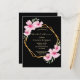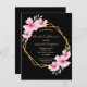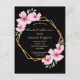 Um convite para noivas tropicais elegante. Com uma falso estrutura geométrica dourada decorada com hibisco rosa, flores tropicais com um pouco de verde. Cor de fundo preta. O texto: o Chá de panela e a noiva do nome de ser são escritos com um moderno script de estilo manchado. Texto do ouro. Traseiro: cor preta do fundo.