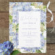 Este design apresenta flores azuis e brancas de hydrangea, de cor aquática, com uma fina estrutura de periwinkle em torno de um centro branco. A parte traseira está disponível em um design inteiro das hydrangeas ou em um azul de periwinkle sólido. Este cartão faz parte do Periwinkle Blue & White Hydrangea Flowers Wedding Suite de cartas criadas pela imprensa simplesmente de farmácia.