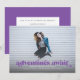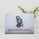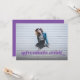 Este cheio sangrou o anúncio da graduação em fotos e o convite contém a palavra "aventuras aguardam" em roxo. Ele tem espaço para os detalhes do seu formando na frente, com mais espaço para texto na parte traseira da placa.