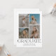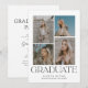 Um anúncio de chic e de graduação mínima mostrando quatro de suas fotos favoritas dispostas em uma grade, com a palavra "graduação" em negrito sob as fotos. A parte traseira apresenta os detalhes da sua festa de formatura. Este design moderno e atraente irá bem com qualquer tipo de fotografia.