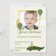 Um convite de aniversário com jacaré verde vestindo uma festa em fundo listrado amarelo e balões. Fácil personalizar o texto com os detalhes da sua festa e sua foto favorita.