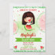 Convite de aniversário de melancia para a menina. Um de uma festa de melão. Um convite bonito para a sua festa de aniversário docinho com melancias vermelhas e verdes e uma garota morena. Convide seus amigos para uma doce celebração com este convite à melancia vermelha e verde. Simplesmente edite este menu de personalização fácil de usar modelo para torná-lo especial.