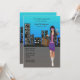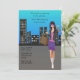 Um convite moderno que mostra uma paisagem urbana como fundo e uma linda jovem atravessando uma rua e segurando uma bolsa. Este é um convite maravilhoso para uma festa de aniversário de uma adolescente, uma despedida de solteira ou um convite para fazer compras.