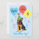 Vocês são convidados para uma pata de aniversário com um filhote de German shepherd giro, vestindo chapéu de festa, rodeado por balões e galerias coloridos. O texto pode ser facilmente personalizado. Fornecimentos correspondentes disponíveis.