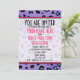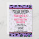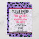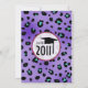 Um convite de formatura com um fundo de impressão leopardo roxo na frente e atrás. Texto cor-de-rosa e preto e aparas cor-de-rosa. O lado oposto apresenta um círculo dentro rosa de texto "Classe de 2011" com graduação em preto que ilustra.