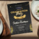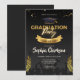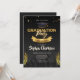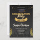 Um convite simples e clássico com um boné de formatura, confete e ouro sobre fundo preto