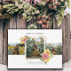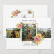 Um anúncio de formatura moderno único com 3 fotos de uma mulher em um campo de girassóis. Solarenga e alegre, com um quadro de ouro com flores e abelhas para elevar o estilo fotográfico. Substitua os exemplos de fotos por suas próprias fotos de graduação. A parte de trás do anúncio apresenta a frase: no próximo capítulo". Você pode manter a frase ou apagá-la.