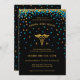 Convite para formatura de Enfermagem Escolar com confete azul e dourado e símbolo de ouro caducius. Personalize o texto da sua própria cerimônia de formatura do RN! Nota: A folga dourada é um efeito impresso, não será utilizada nenhuma folga real no fazer destes convites.