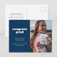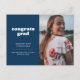 Anuncie a grande conquista do seu formando com este anúncio e convite de graduação simples, mas na moda. Ele apresenta as palavras "felicats formando" em uma fonte de estilo retrô branco em um fundo azul escuro, assim como espaço para uma foto na frente. Use o cartão postal para obter detalhes sobre a celebração do seu formando.