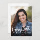 Um convite de formatura de script escrito à mão. Este convite de graduação apresenta um roteiro casual de tendências com uma foto. Todo o texto na parte frontal e traseira da placa pode ser personalizado. Troque a foto por uma foto do formando para criar o convite perfeito para a formatura.