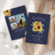 Este elegante convite para a graduação de girassol apresenta um buquê de girassol de cor d'água sobre fundo de marinho. A parte de trás do cartão contém mais girassóis e três fotos do formando. O verso também tem um espaço para seus detalhes de nome e graduação abaixo das fotos.