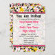 Um convite de graduação único com um fundo de plástico preto, amarelo, verde e rosa com cor rosa quente. Texto rosa e preto. Personalize com detalhes do seu próprio evento. O lado oposto apresenta design de tela de tinta sólida. O texto em forma de círculo cor-de-rosa dentro diz "Classe de 2011" em rosa e preto com uma ilustração de um boné de formatura preto. Excelente para o formando da escola de arte. Procure itens correspondentes na seção "compro de graduação" da loja de Escolas Rosa.