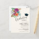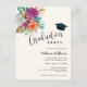 Convite à graduação com um arranjo floral que contenha rosas bonito, cor-de-rosa, laranja e brancas, rodeadas de folhas verdes.
