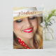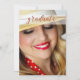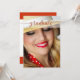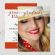 Convite de festa de formatura elegante com sua própria foto com uma cobertura vermelha estilizada de script na frente. No verso está seu texto personalizado com outro cabeçalho de script e fundo vermelho superior e inferior.