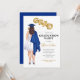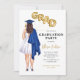 Convite para formatura feminina mais retrato feminino desenhando vestido branco, boné e vestido azul, cabelos castanhos longos. As letras FORMANDO em balões faux gold foil style. Personalize com detalhes de festa de formatura, ano de aula e nome da escola. Envie-me uma mensagem para os itens correspondentes.