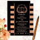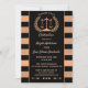 O convite de festa de formatura elegante com lourel deixa escalas de moldura em ouro rosa estilizado sobre fundo preto. Em ambos os lados há listras de ouro rosa a preto.