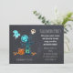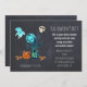 Um convite legal para a festa de Halloween. Uma legal cena de halloween assustadora. Um fantasma azul gelado flutua no ar. Uma velha árvore morto tem uma coruja sentada em seus galhos e um morcego pendurado de cabeça para baixo. Uma mão está ascensão de uma sepultura antiga. Os morcegos estão voando ao redor de um cheio luando. Alguns doces estão cheios de uma abóbora de dentro de brim com milho doce espalhado. Um crânio paira no ar. Tudo em um fundo preto de quadro negro. Personalize/personalize facilmente com os detalhes do seu partido.