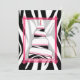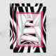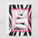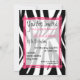 Um convite de na moda de aniversário com um retângulo cor-de-rosa com seção central sobre um fundo de impressão zebra na frente e atrás. A primeira ilustra um bolo de aniversário de impressão rosa e zebra correspondente com quatro níveis fora do centro arredondados. O topo do bolo tem design de "16". Personalize o texto rosa e preto do lado oposto com detalhes da sua ocasião.