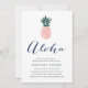Aloha! Está organizando um jantar de boas-vindas de casamento com tema havaiano ou luau antes do grande dia? Convide amigos e familiares com nossos convites de jantar de boas-vindas de casamento tropicais chiques, apresentando uma ilustração de abacaxi rosa e verde com "aloha" em caligrafia manuscrita. O verso dos cartões tem um padrão floral de hibisco tropical.