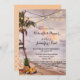 Convite de Janto de ensaio romântico com uma praia tropical com palmeiras ao pôr do sol. As árvores são decoradas com lamparinas festivas e têm uma oferta de abacaxi e flores nas raízes. Linda para uma praia ou celebração de destino.