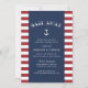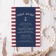 Os convites de janto de ensaio de temas náuticos de Verão, em vermelho, branco e azul, apresentam um fundo listrado vermelho e branco com as suas informações de evento, em branco, em azul marinho, acentuadas pela ilustração ancorante de um navio e pela tipografia festiva. Perfeito para jantas de ensaio em iates, veleiros ou cruzeiros jantados em marina, bote-clube ou locais de temas náuticos. Convites invertem para um padrão de minúsculas âncoras brancas em azul marinho correspondente.