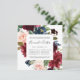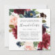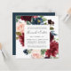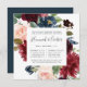 Nosso convite para o ensaio floral do Radiant Bloom em um formato quadrado único enquadra seu ensaio de cerimônia de casamento e janta detalhes com flores pintadas de aquarela em rosa-claro, burgundy marsala e marinho azul, com folhagem verde de eucalipto.