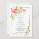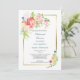 Um buquê floral bonito de cor rosa-coral, cor-de-rosa-lavanda, branco, amarelo-pálido, ouro e ninho azul entre as folhas verdes-lacrimogêneas no canto superior esquerdo deste convite de janto de ensaio de casamento. Uma imagem floral coordenadora menor está no canto inferior direito. Por trás das duas imagens está um quadro brilhante de ouro, que inclui seu texto personalizado. O texto está em cinza e verde-lacre no centro. A imagem floral de aquarela e o texto são colocados sobre um fundo branco. O fundo do convite é ouro antigo sólido. Certifique-se de ver os produtos de casamento correspondentes na nossa loja.