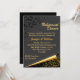 Elegante convite formal de janto de ensaio de casamento feito em uma cinza escura de carvão, com gráficos de um canto inferior enrolado mostrando ouro, com fundo preto e ouro florescendo. A parte superior do convite tem gráficos de um jato preto que floresce no canto superior esquerdo. O texto castanho claro do ouro está pronto para personalizar o seu evento de casamento. Adorável convite que a noiva e o noivo vão acalmar.