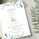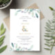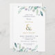 Barato personalizado estampado convites para janto de ensaio de casamento personalizados com seus detalhes de evento. Este elegante design apresenta uma folha de alumínio dourada falso com folhagem azul e verde delicada de cor d'água sobre fundo branco. Use as ferramentas de design para personalizar o texto, editar as fontes e as cores ou adicionar suas próprias fotos para criar um convite de festas minimalista moderno.