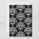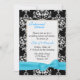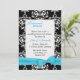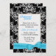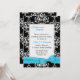Um convite para janto de ensaio de casamento elegante feito numa cor damasco a preto e branco, com uma área de texto branco sobre damasco branco. Gráficos de uma fita e arco turquesa bonito, decoram a parte inferior do convite. O texto em preto e turquesa está pronto para personalizar o seu evento.