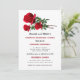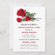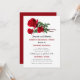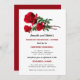 Ensaio de cerimônia de casamento e janto de ensaio, convite com design rosa vermelha. Envie este anúncio para que a festa de casamento saiba a hora e a localização do ensaio para o casamento. Incluir informações sobre o janto posteriormente. O texto vermelho e preto alternado em fontes impressas e de script cria um convite elegante e informativo. Os caules rosa realísticos decoram o topo da papelaria. O reverso é vermelho sólido.