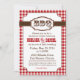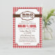 Um janto de ensaio de churrasco para um casal. Picnic, barbeque, churrasco. Vermelho e marrom. Verificado e padrão de gingham, a região oeste do país. Bridal ou chá de casamento, churrasco de férias, celebração de aniversário, etc.