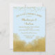 Um elegante convite de janto para o ensaio de casamento azul e dourado com poeira de confete de ouro e borrão de ouro no fundo.