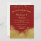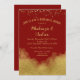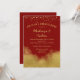 Um elegante convite jantado para o ensaio de casamento vermelho e dourado, com poeira de confete dourada e borrão dourado no fundo.