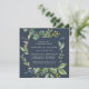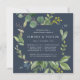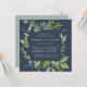 Nosso convite de janto de ensaio Eucalyptus Grove em um formato quadrado único enquadra seu ensaio de cerimônia e janta detalhes com a cor d'água, folhas verdes e minúsculos botões azuis de marinho em um fundo azul enfumaçado. Uma escolha moderna, porém orgânica, para o outono e jantadas de ensaio de inverno, com folhagem botânica verde e elegantes.