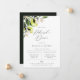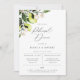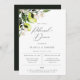 Limões botânicos de cor aquosa elegantes, folhas e arranjo florescente, convite para janto de ensaio. Design de fotografia e tipografia moderna. O plano de fundo apresenta cor verde de floresta de mossy escura sólida.