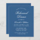 Um convite clássico de janto de ensaio azul. É um texto simples, apenas branco sobre fundo azul. As palavras "Janto de ensaio" e o nome são escritos num guião caligráfico elegante.