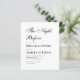 Um convite simples e minimalista para jantar ensaios em preto e branco. Tem apenas texto preto sobre fundo branco. O título "A Noite Antes" é escrito em um roteiro caligráfico elegante. O texto fica alinhado.