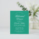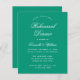 Um simples convite de janto de ensaio com uma cor moderna: esmeralda verde. Tem apenas um texto branco sobre fundo esmeraldo. As palavras "Janto de ensaio" e o nome são escritos num guião caligráfico elegante.