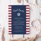 Os convites de janto de ensaio de temas náuticos de Verão em vermelho, branco e azul apresentam um fundo listrado vermelho e branco com as suas informações de evento em branco em azul marinho, acentuadas pela ilustração da roda de um navio. Perfeito para jantas de ensaio em iates, veleiros ou cruzeiros jantados em marina, bote-clube ou locais de temas náuticos. Convites invertem para um padrão de minúsculas âncoras brancas em azul marinho correspondente.