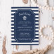 Os convites de janto de ensaio náutico de temas de resumo em azul e branco clássicos de marinho apresentam um fundo listrado de marinho e branco com as informações de evento em branco num elemento central azul de marinho, acentuado pela ilustração da roda de um navio. Perfeito para jantas de ensaio em iates, veleiros ou cruzeiros jantados em marina, bote-clube ou locais de temas náuticos. Convites invertendo a um padrão de minúsculas âncoras de marinho.