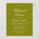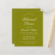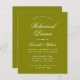 Um simples convite à janta de ensaio com uma cor moderna: o verde-oliva. Tem apenas um texto branco sobre fundo verde-oliva. As palavras "Janto de ensaio" e o nome são escritos num guião caligráfico elegante.