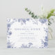 Projetado para coordenar com a nossa coleção Toile French Blue Garden, este convite de janto de ensaio personalizável apresenta um floral ao estilo francês no estilo do país em azul-mochila. Para personalização mais avançada deste design, por exemplo, alteração do layout, da fonte ou do tamanho do texto, clique no botão "PERSONALIZAR" acima. Por favor, entre em contato comigo para qualquer pergunta!