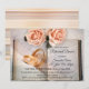Um convite romântico para o ensaio com um tema de livro com duas rosas de pêssego e anéis de casamento num livro com fundo de praia. Bonito para um casamento planejado de biblioteca ou um casal que adora ler e/ou escrever.