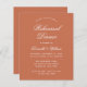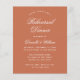 Um simples convite de janto de ensaio com uma cor moderna: terracota (castanho avermelhado). Tem apenas um texto branco sobre fundo de terracota. As palavras "Janto de ensaio" e o nome são escritos num guião caligráfico elegante.