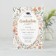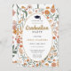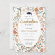 Um convite para festas de formatura de flores na moda, primavera, fresco, com cores azuis, de laranja e cor-de-rosa com folhas verdes. Se você quiser alterar o estilo da fonte, a cor ou o posicionamento do texto, basta clicar no botão "Personalizar mais" e usar a ferramenta design simples. Disponível em impressão, como download digital ou ambos.